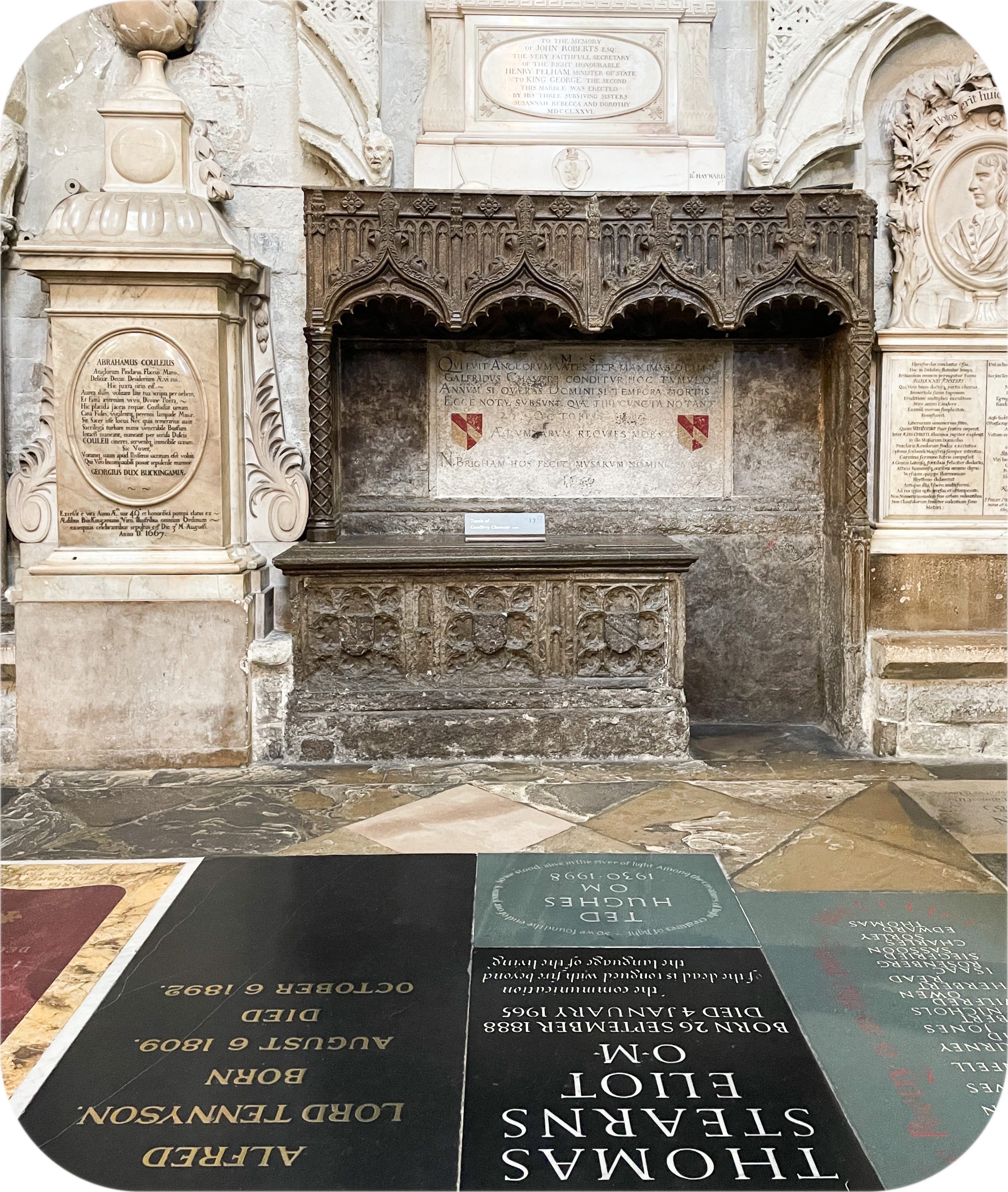 T.S. Eliot is the only American with a memorial plaque here. He was offered burial at the Cathedral, but had made other plans in his will. He would have been the only American buried in Poet’s Corner - he’s now the only American with a memorial plaque here.