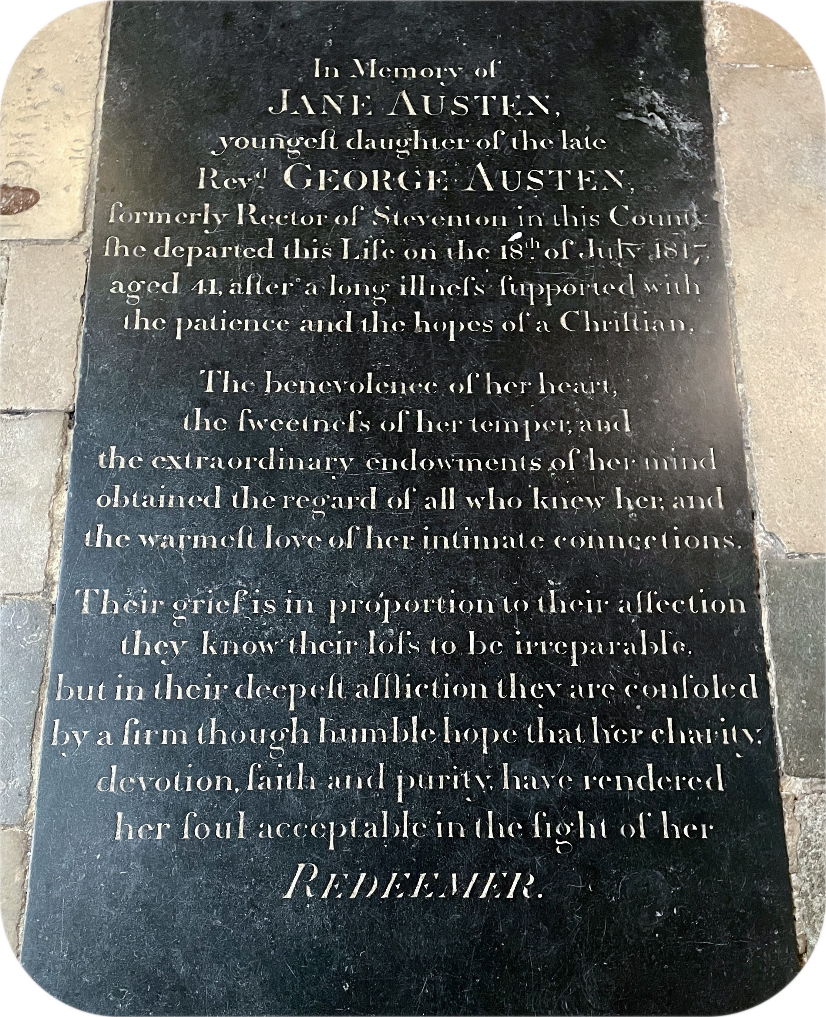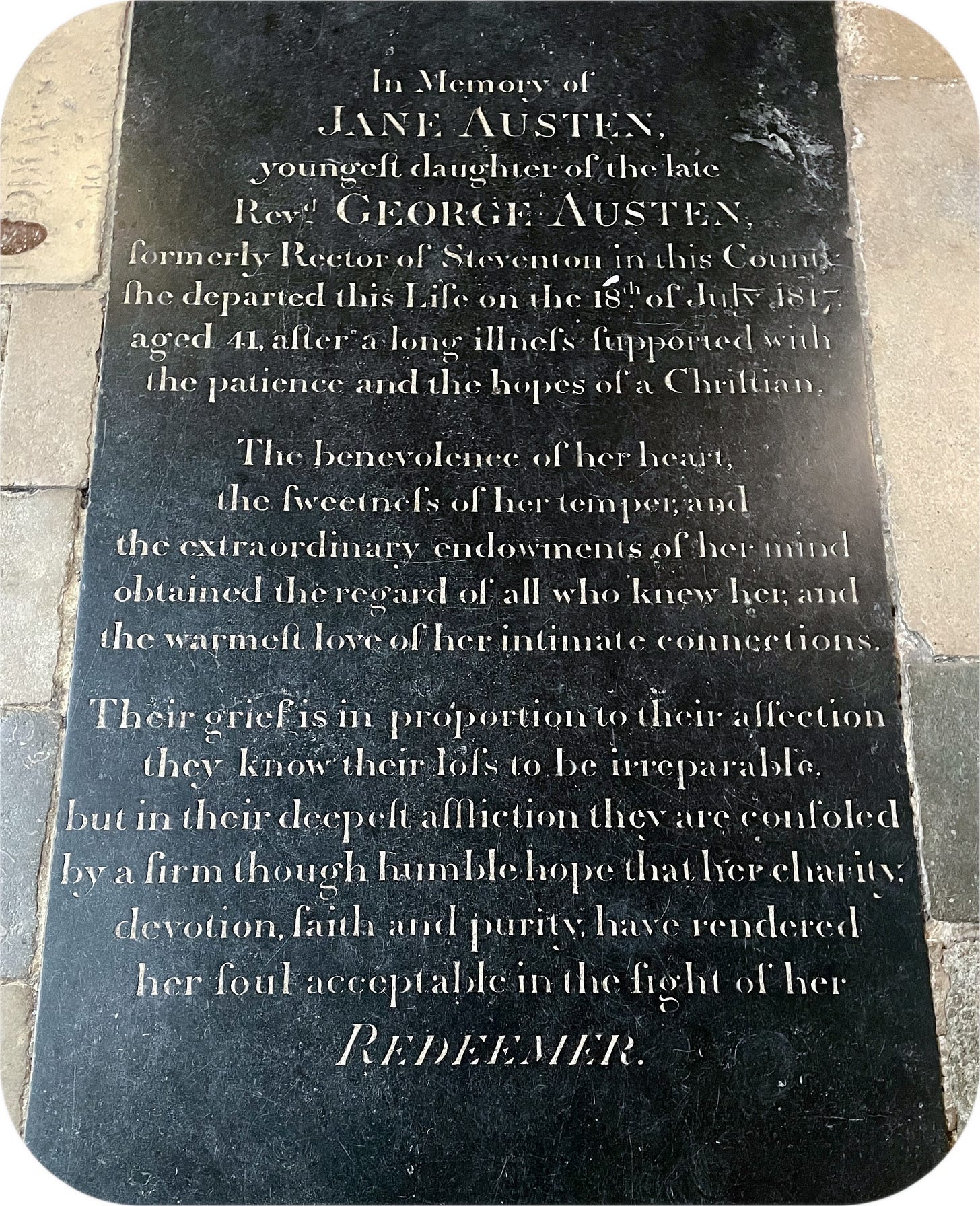 It is an extremely heartfelt memorial, but makes no mention of her writing, apart from the allusion to the “extraordinary endowments of her mind”. In 1869, Jane’s nephew James Edward Austen-Leigh wrote the first biography of the author, A Memoir of Jane Austen. A brass plaque was placed nearby her grave, funded by the proceeds of this memoir, that clarifies Jane’s status as a writer.