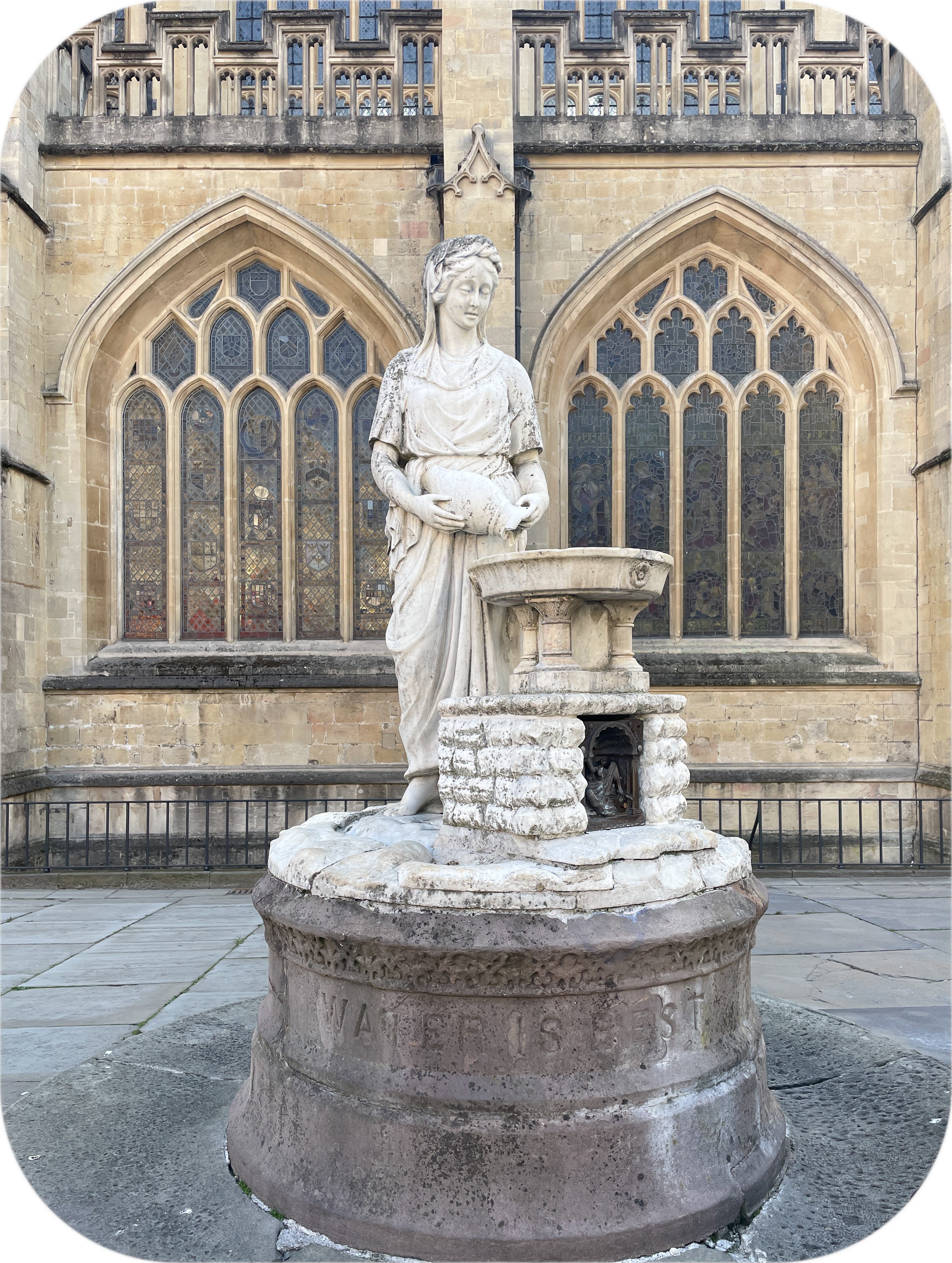 Just past Laura Place is Pulteney Bridge, designed by the great English architect Robert Adam. Inspired by the Rialto Bridge in Venice, and the Ponte Vecchio in Florence, Robert Adam lined the elegant bridge with little shops on either side. Today, they are filled with art galleries and bakeries, a lovely florist and several cafés. I walk across the bridge, turn left and head towards the heart of the city. Along the way, I pass a fountain depicting Rebecca at the well, with the inscription WATER IS BEST at the base. I turn the corner and walk into the paved churchyard of Bath Abbey.