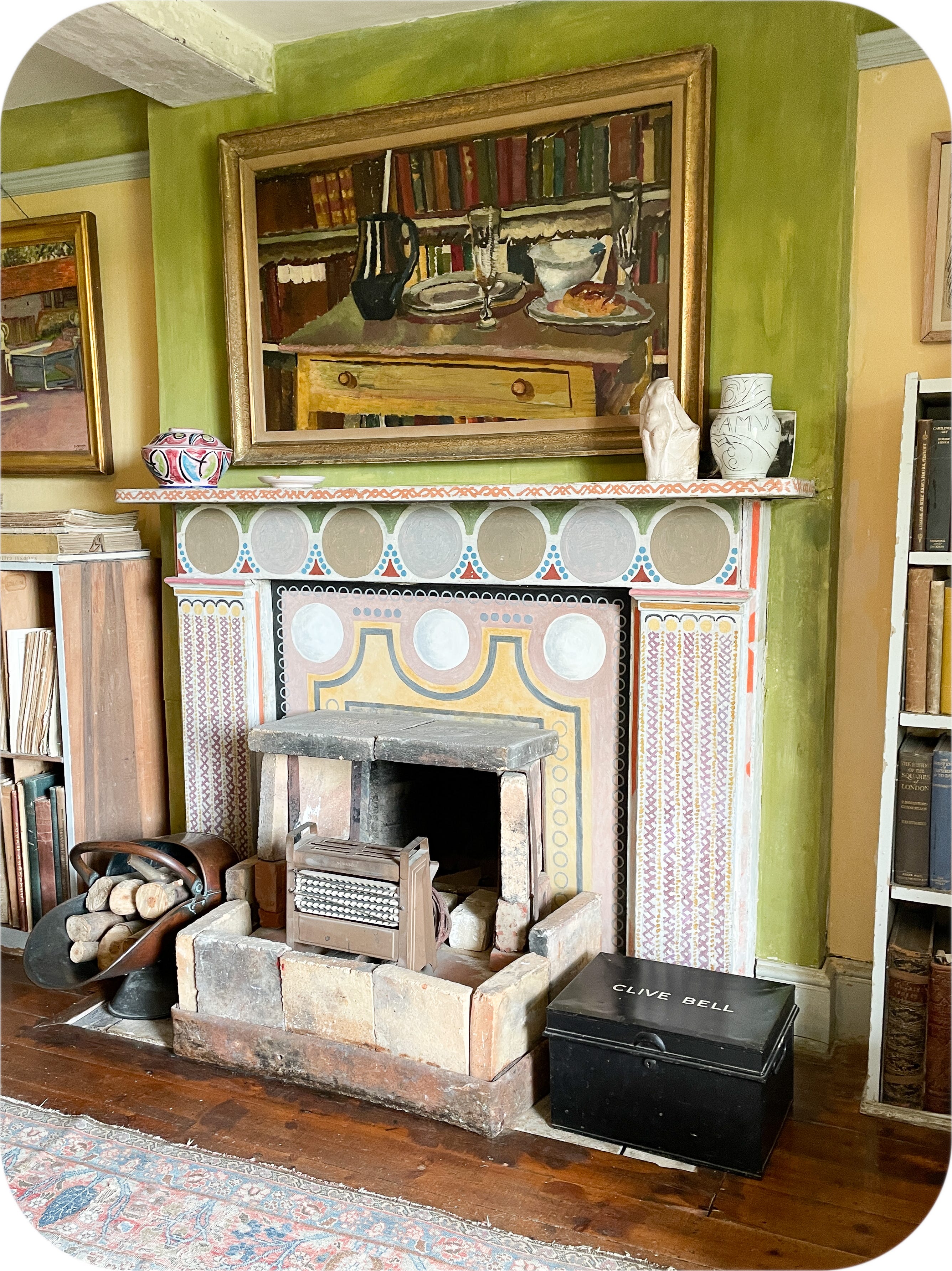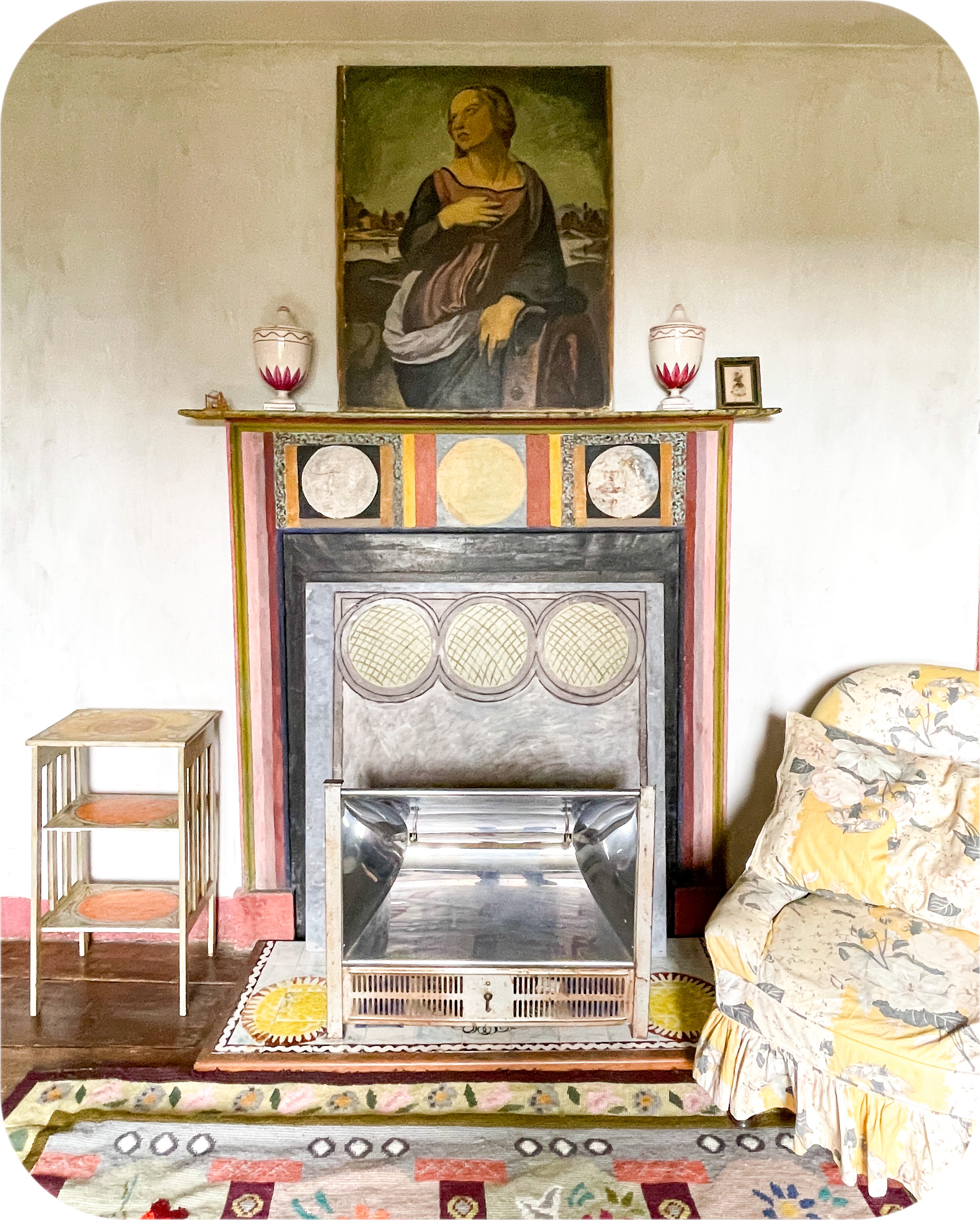 Beds are painted, bookcases are painted, mantels are painted. Chairs are covered with fabric designed by Duncan, and the curtains were hand-sewn by Vanessa. Roger Fry designed and installed the fireplaces, and Duncan’s mother, Ethel, contributed endless needlepoint rugs and cushions. (Honestly - so many. I can’t imagine how she got it all done.)