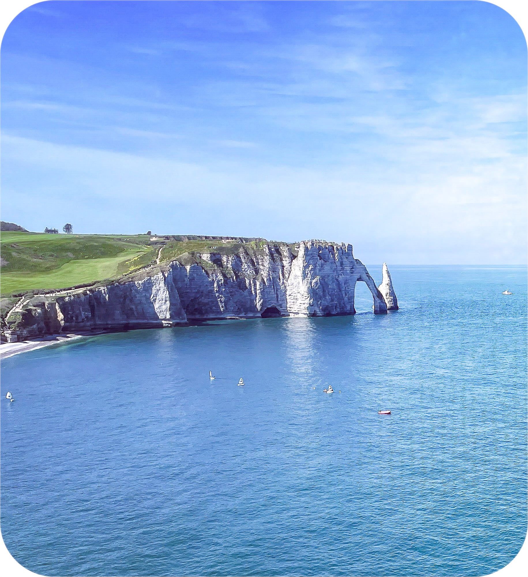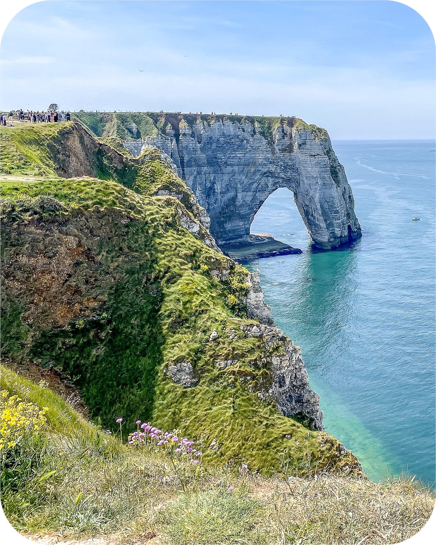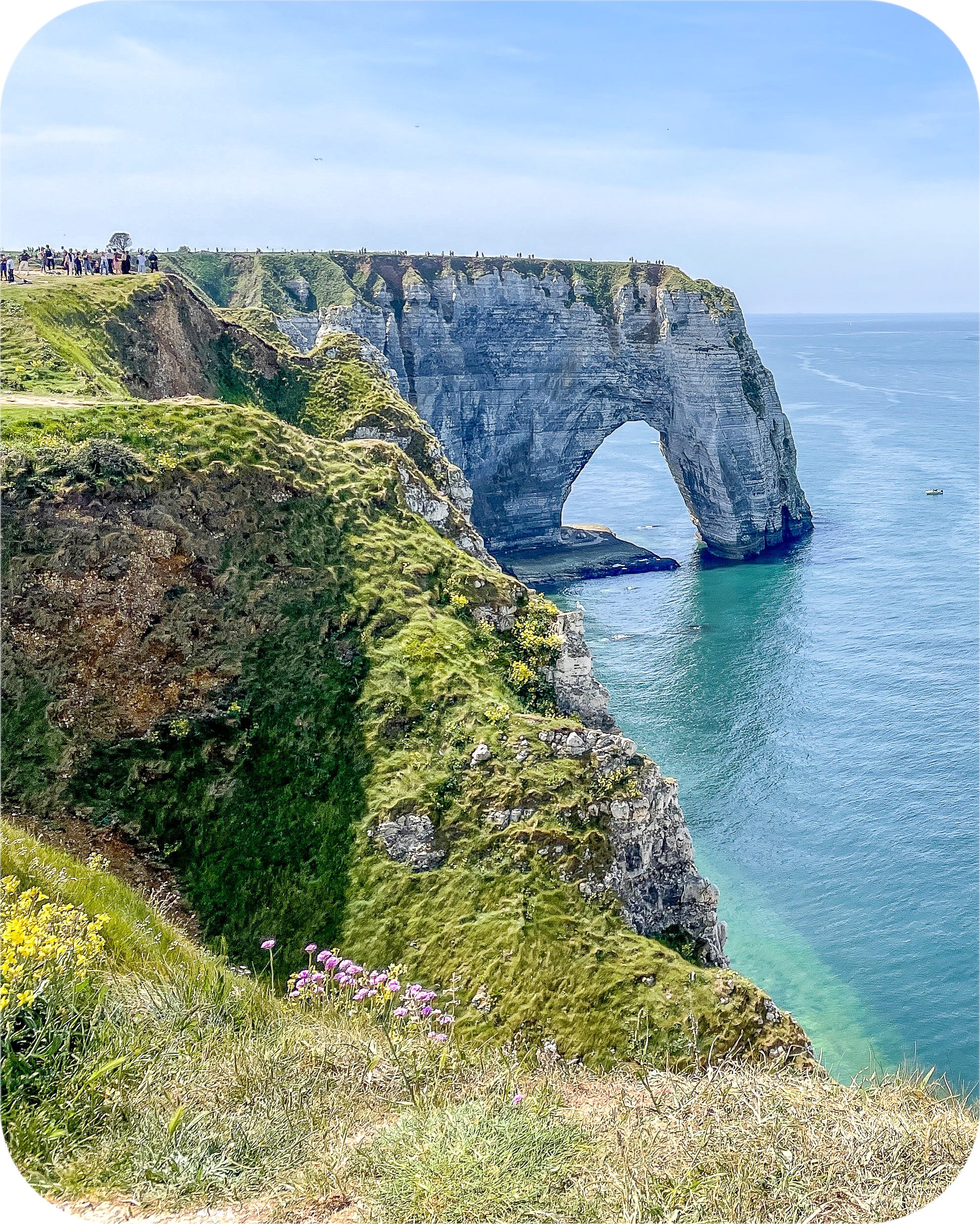 The small town of Étretat is sandwiched between two large cliffs. It is the cliffs that are the star of the show - the cliff to the north of town is called the Falaise d’Aval, and the small arch at the base is called the Porte d’Aval. The cliff to the south is called the Falaise d’Amont, and the large arch that looks like an elephant’s trunk at the point of it is called the Porte d’Amont. Right off of this cliff is a large, pointy rock formation called l’Aiguillle, or The Needle. A little bit further south along the coast is the largest arch of all, La Manneporte.