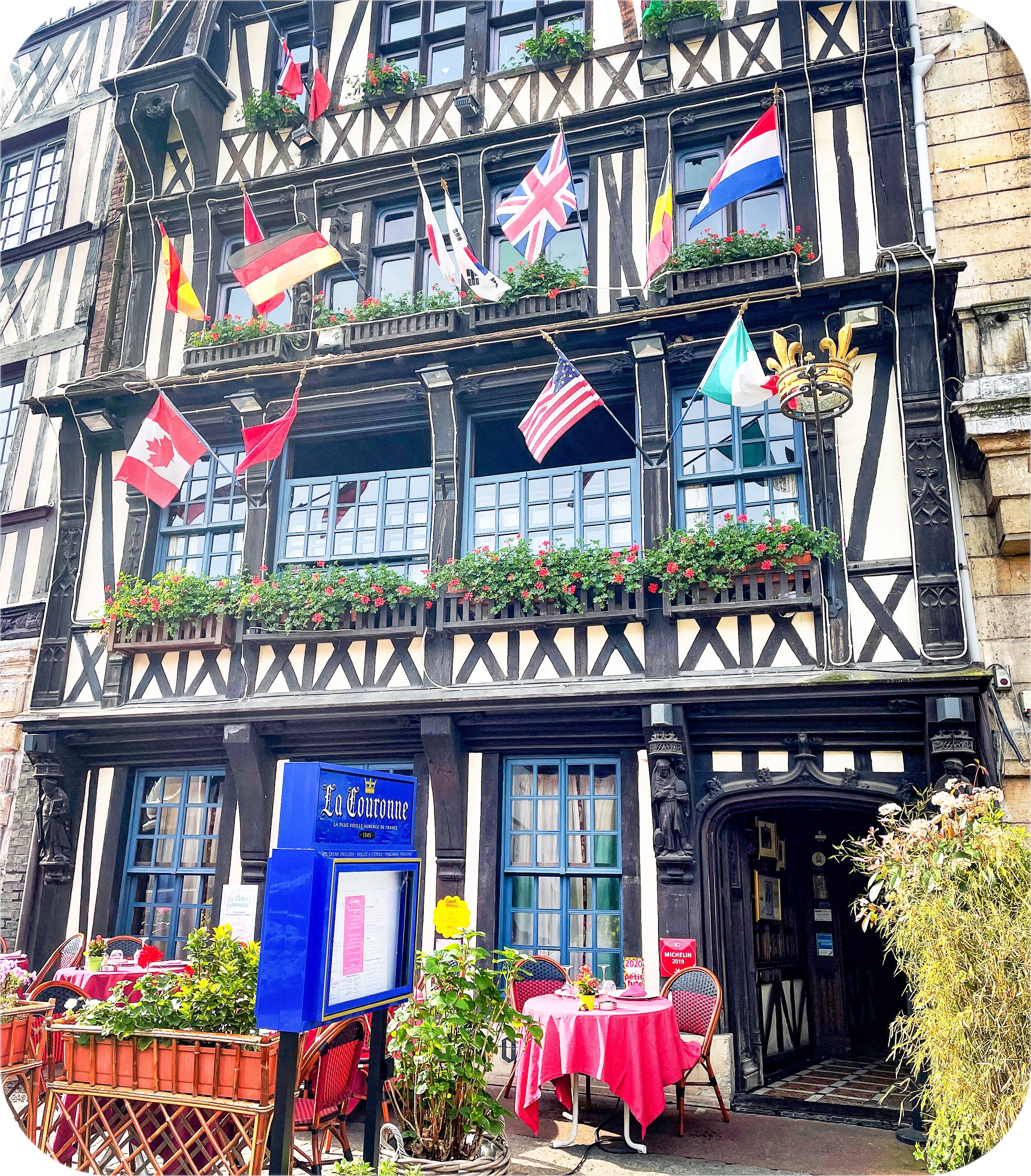 I expect there to be quite a few visitors at Joan’s memorial, and at first glance there are a lot of people milling about. But none of them are looking at Joan’s plaque, or at her church. They are all turned 90 degrees to the right, looking intently at a row of restaurants along one side of the square. Actually, they are lookin at one restaurant in particular: La Couronne. Founded in 1345 - before the Gros Horloge was built, and before Joan met her end in the square nearby - La Couronne is the oldest inn and continuously-operating restaurant in France.