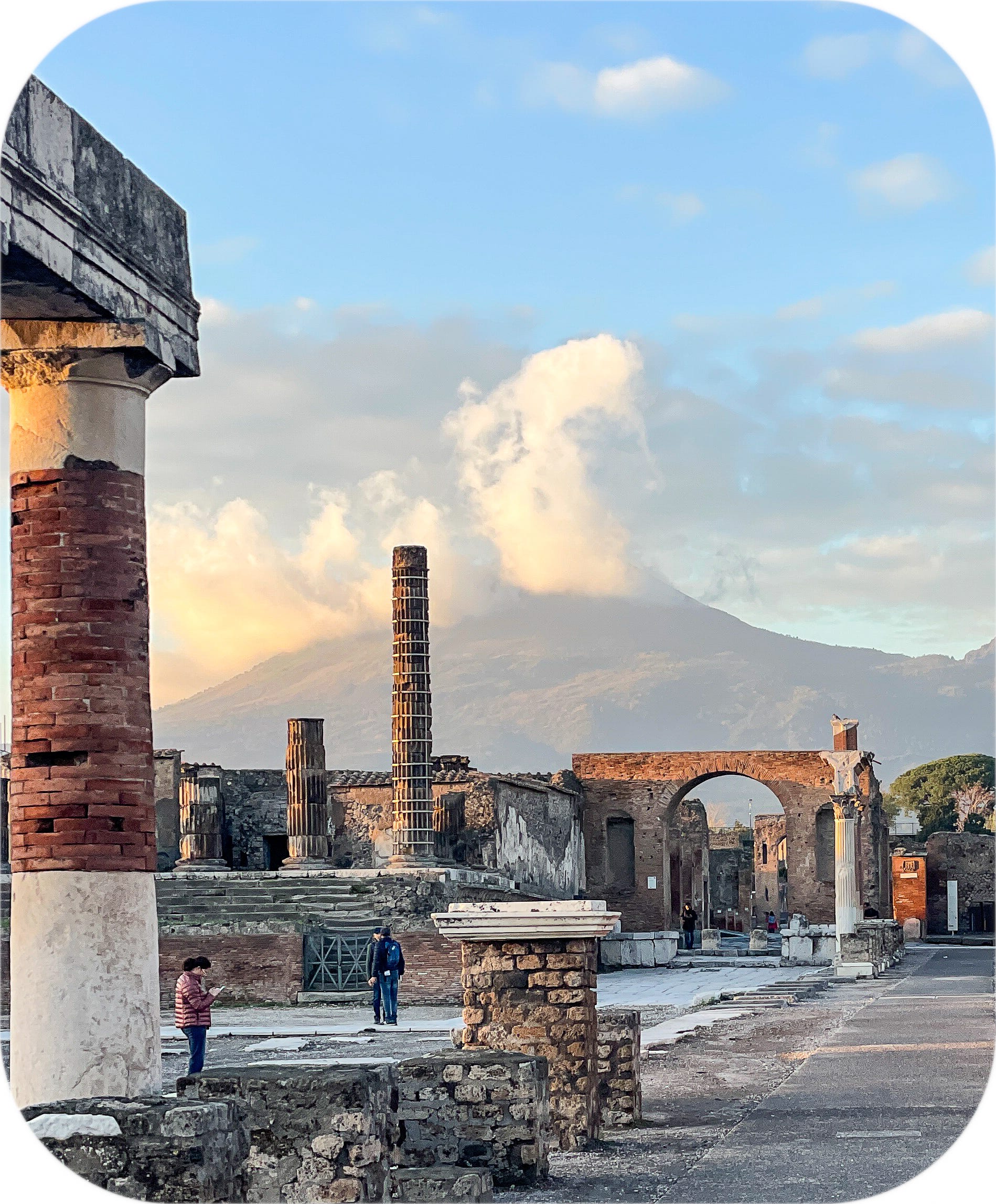 It is getting to be late fall, and the air is chilly when I visit the ruins of Pompeii. As I walk along the grid of streets the skies turn alternately blue and then grey - as skies do in fall - and clouds form and slowly disappear. Later in the afternoon, just as the impending sunset adds a hint of yellow to the horizon I stand in the heart of the city, in the remains of the Pompeiian Forum, and look towards Mount Vesuvius. A series of clouds gather right at the crest. They look for all of the world like smoke and ash.