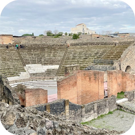 I walk along the main street toward the far end of the site, where the arena sits. The people of Pompeii are becoming more and more alive to me. I imagine them sitting in a bar, drinking wine (and writing on the walls). I imagine them hopping across stones. I imagine them filling the streets, streaming towards gladiatorial games or executions at the arena like Americans heading to a college football game on Saturday afternoon.