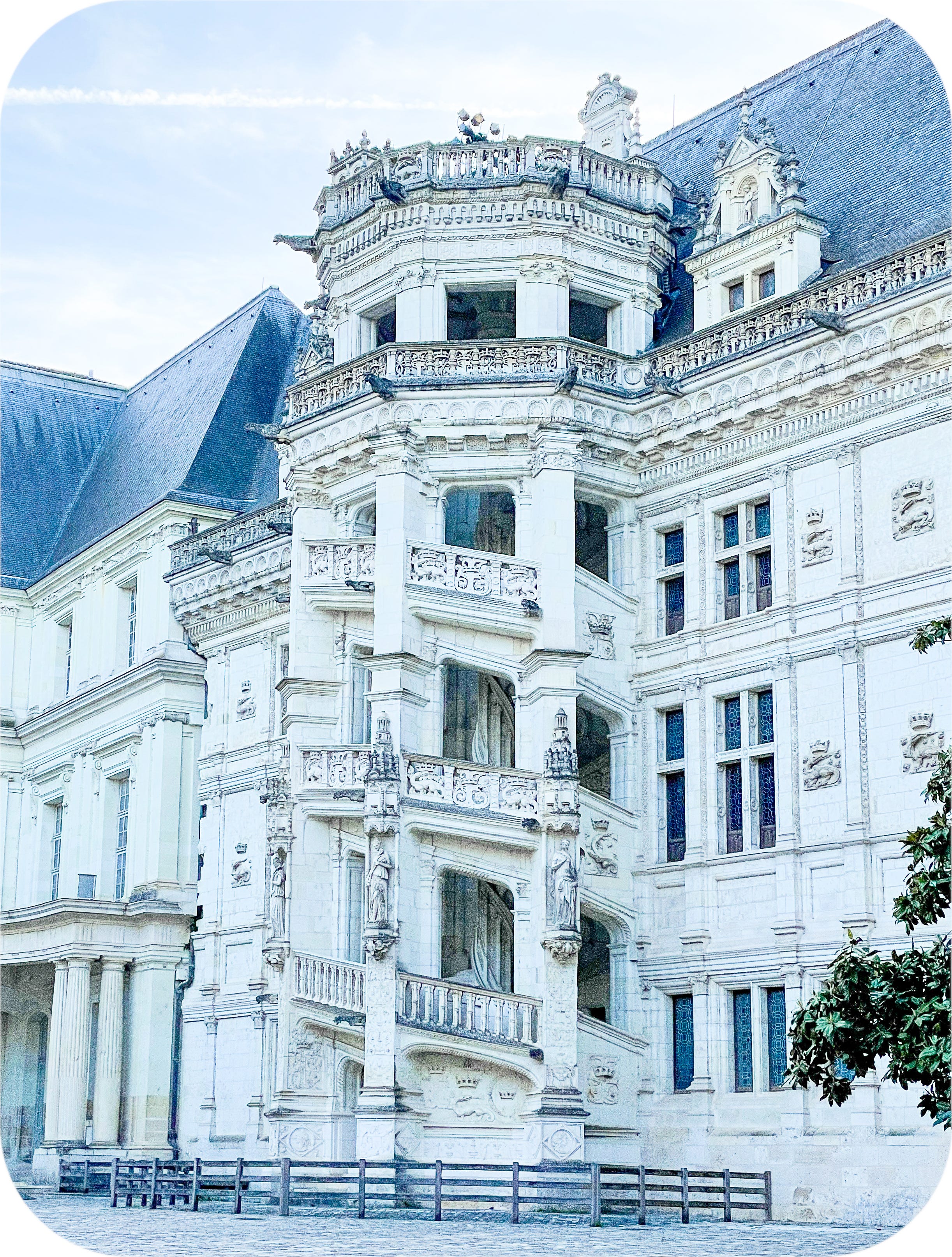 This exquisite, this extravagant, this transcendent piec of architecture is the most joyous utterance of the French Renaissance. It is covered with an embroidery of scupture, in which every detail is worthy of the hand of a goldsmith. In the middle of it, or rather a little to the left, rises the famous winding staircase, which even the ages which moost miused it must vaguely have admired. It forms a kind of chiselled cylinder, with wide interstices, so that the stairs are open to the air.