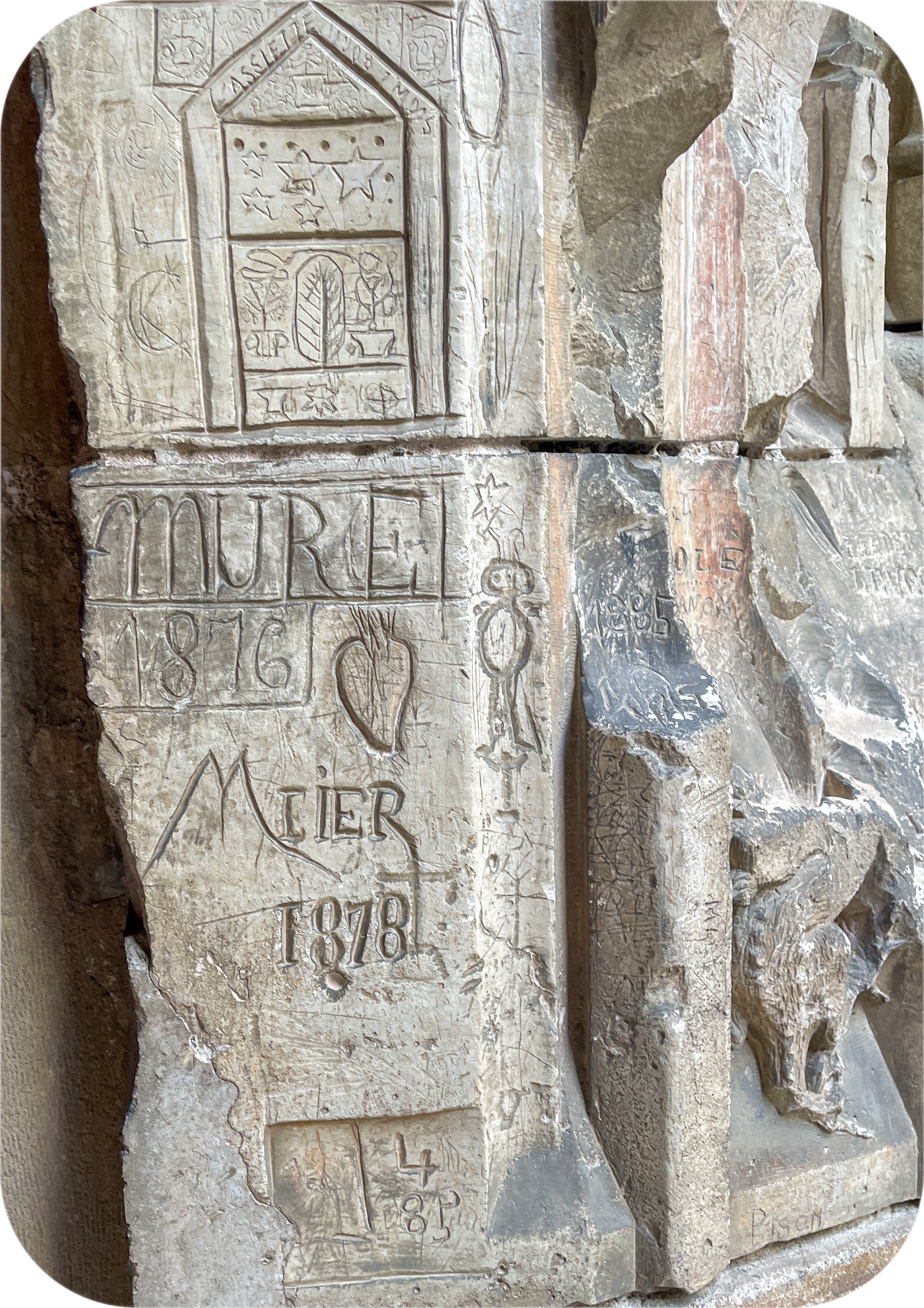 People from the past have left their marks everywhere. Names and drawings. Symbols: mystical and religious. Marks of protection, and notes of remembrance.