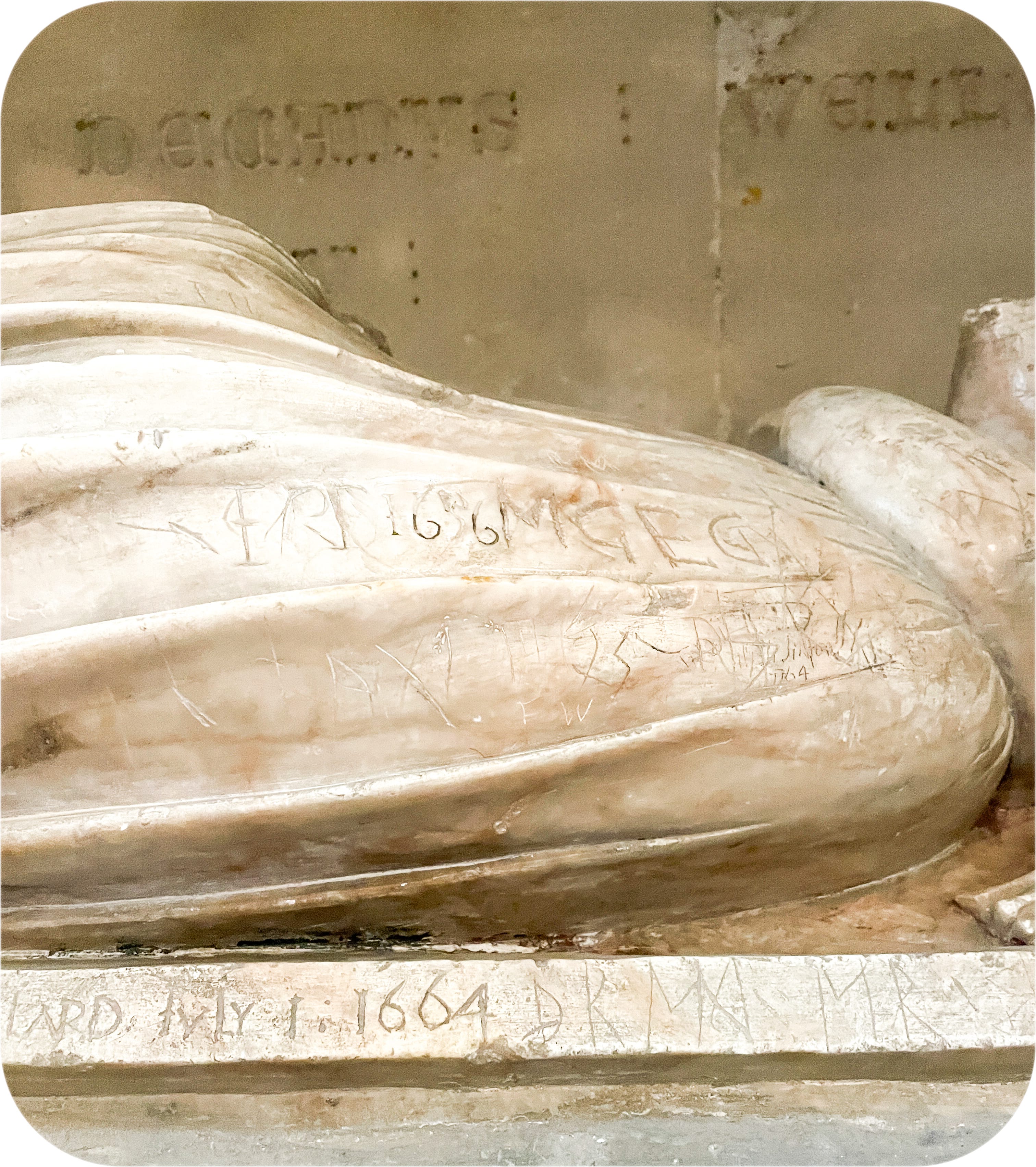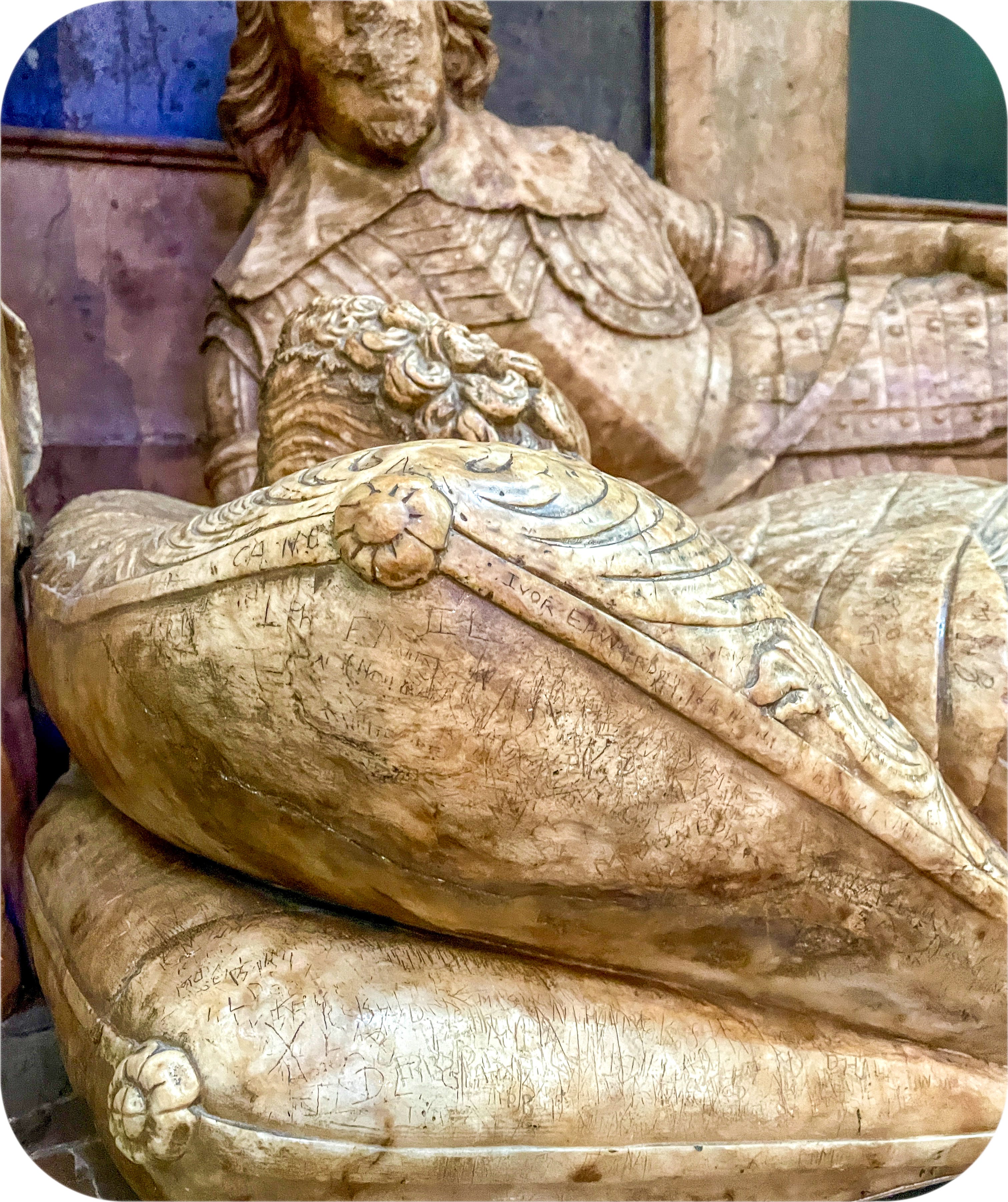 Honestly, I don’t quite understand any of it. Is it a kind of superstition, or a good luck gesture? Carve your name into Shakespeare’s window and you’ll write the novel or play of your dreams? Cut your initials into the face of this bishop and he will cure your illness?